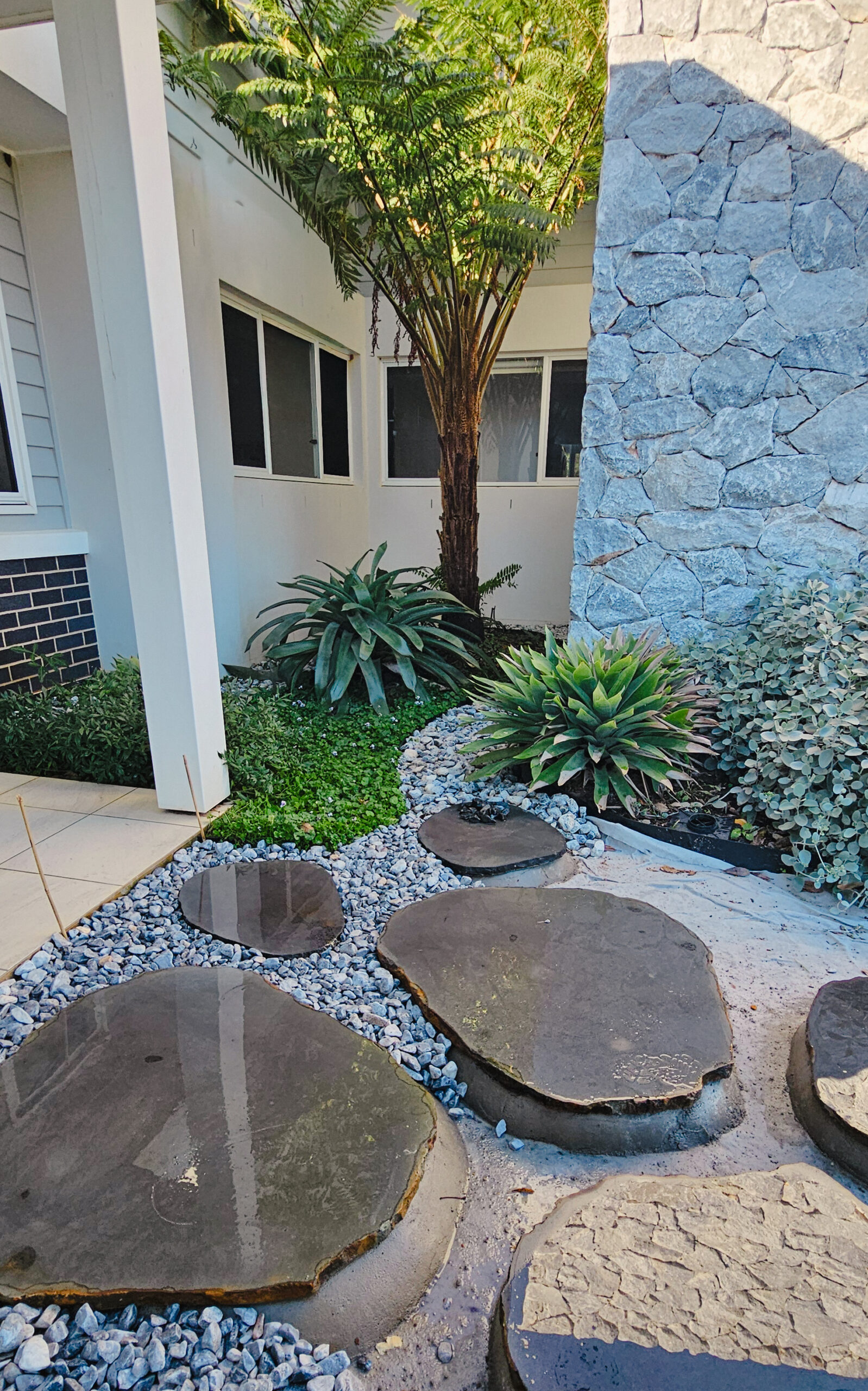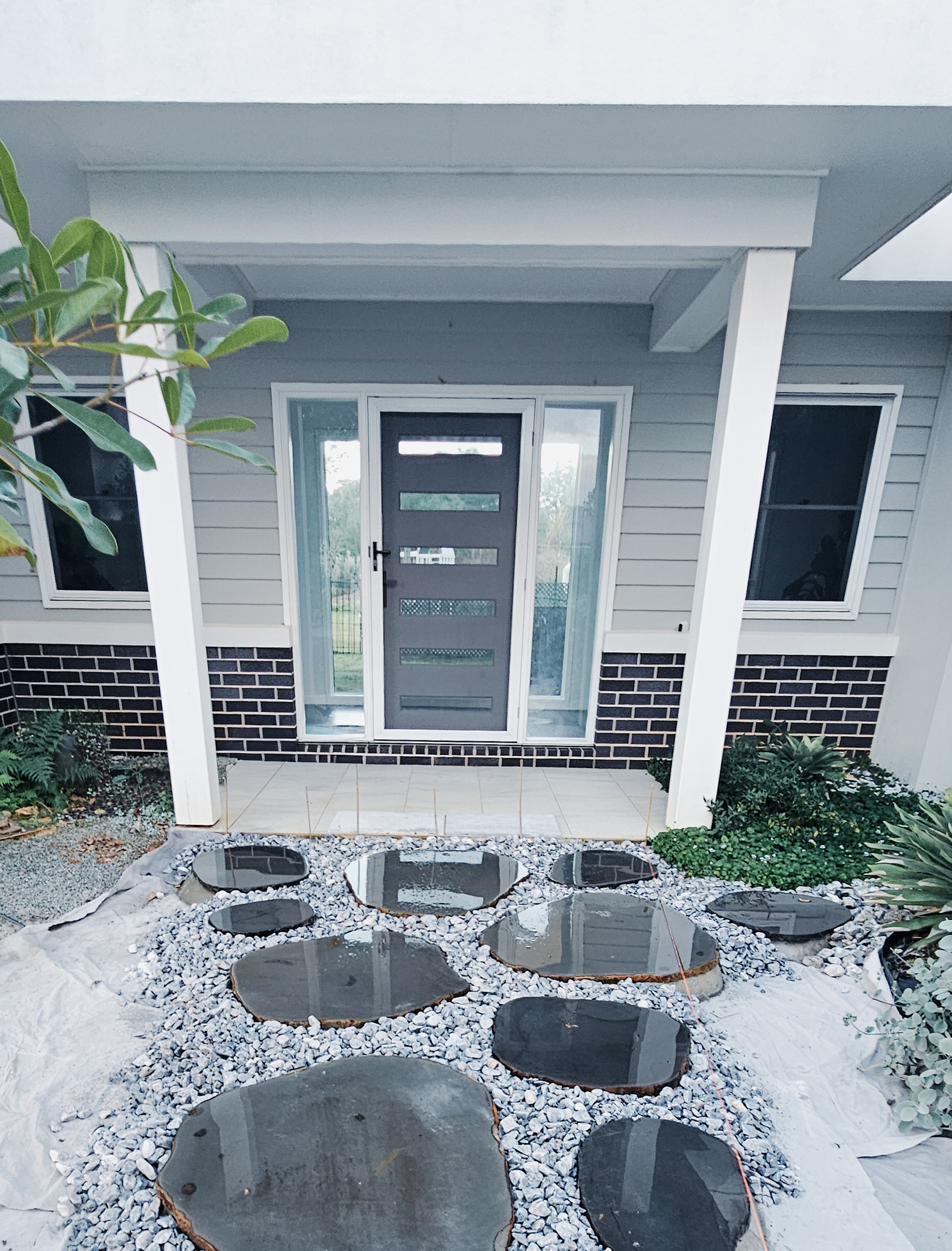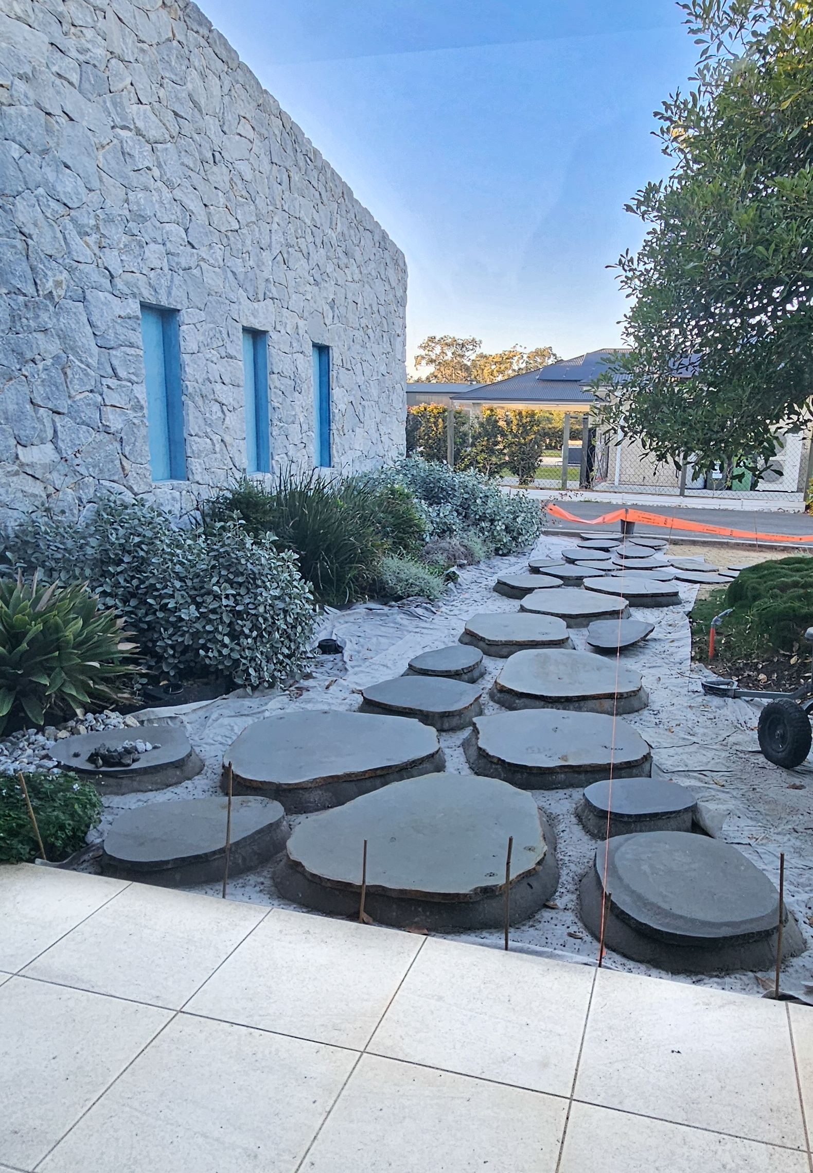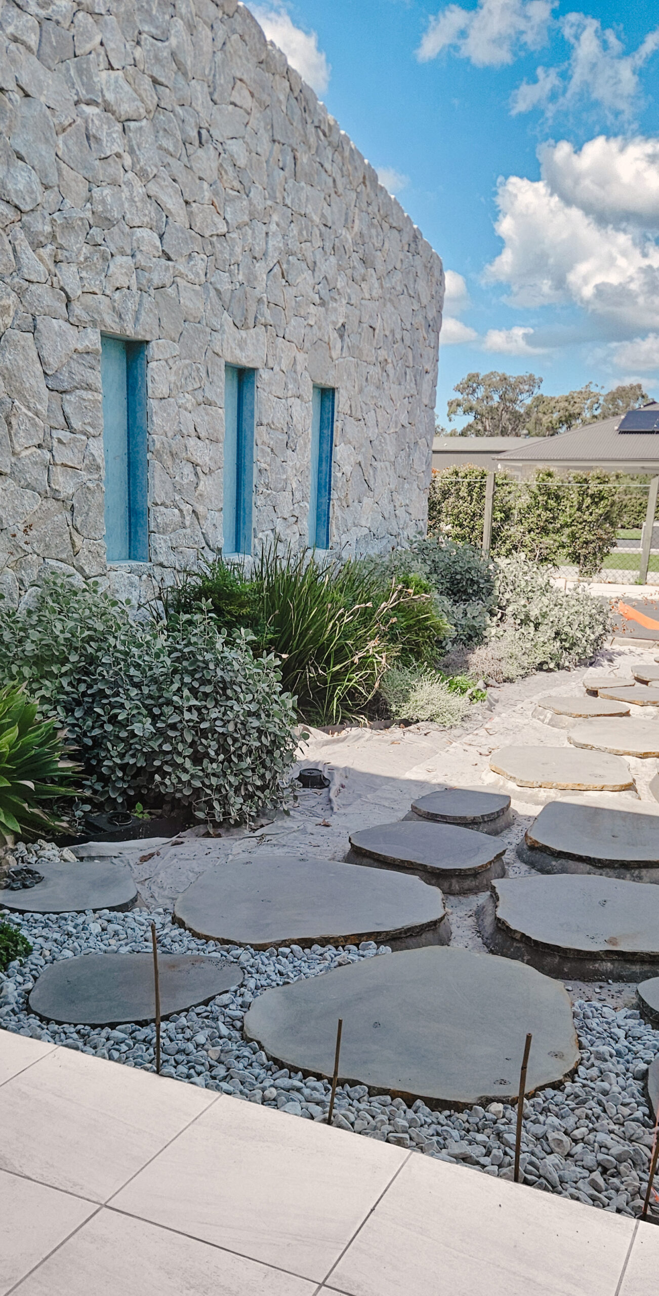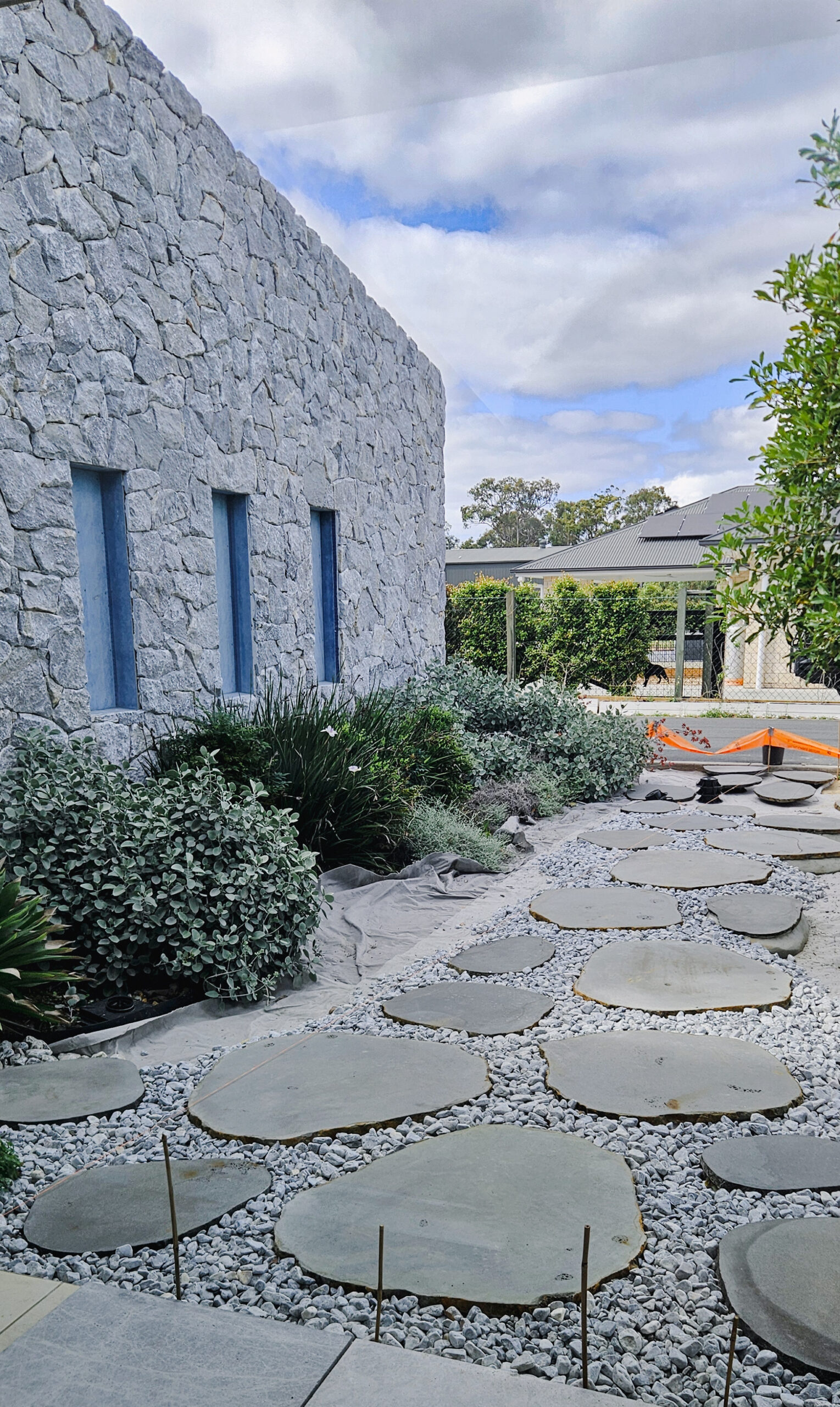 Michael Mitchell Greenspaces prepared a Conceptual Landscape Masterplan, Detail Landscape Design Services for this Exclusive Acerage Estate. Project is currently under construction with the Random Bluestone Entry Steppers and planting underway. The Arrival Experience will be finalised with the completion of three (3) x Custom Perforated Wall Lights and reinforced Turf Parking Zone for Guest & Delieveries.